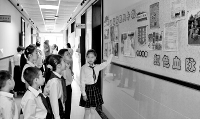 小学生在校园里观看爱国主义教育绘画、板报展览。新华社发