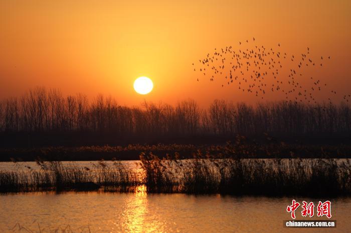 日出时分,菏泽市巨野县龙堌镇龙美湿地公园湖面波光粼粼,飞鸟成群结队。田帅 摄